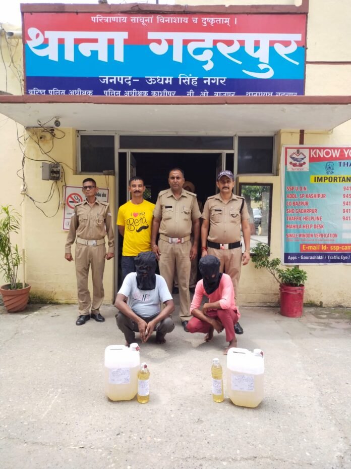 एसएसपी मंजूनाथ टी सी के दिशा निर्देशन में नशे के विरुद्ध चलाए जा रहे अभियान के तहत नशे का कारोबार करने वाले व्यक्तियों के विरुद्ध चलाये जा रहे अभियान के तहत गदरपुर पुलिस ने दो लोगों को अवैध शराब की तस्करी करने के आरोप में गिरफ्तार किया गया। पुलिस ने दोनों के कब्जे से 20 लीटर अवैध कच्ची शराब भी बरामद की। पूछताछ में दोनों ने अपना नाम नन्हे पुत्र डाल चन्द्र निवासी वार्ड न03 गाँधीनगर गदरपुर एवं बाबू राम पुत्र राम बहादुर निवासी ग्राम मौहनागर मिलक खानम जिला रामपुर बताया। पुलिस ने दोनों आरोपियों के खिलाफ धारा 60 आबकारी अधिनियम का केस दर्ज किया हैं। गिरफ्तार करने वाली पुलिस टीम में का0 दिलीप फर्त्याल, होमगार्ड शाहिद आदि मौजूद थे।