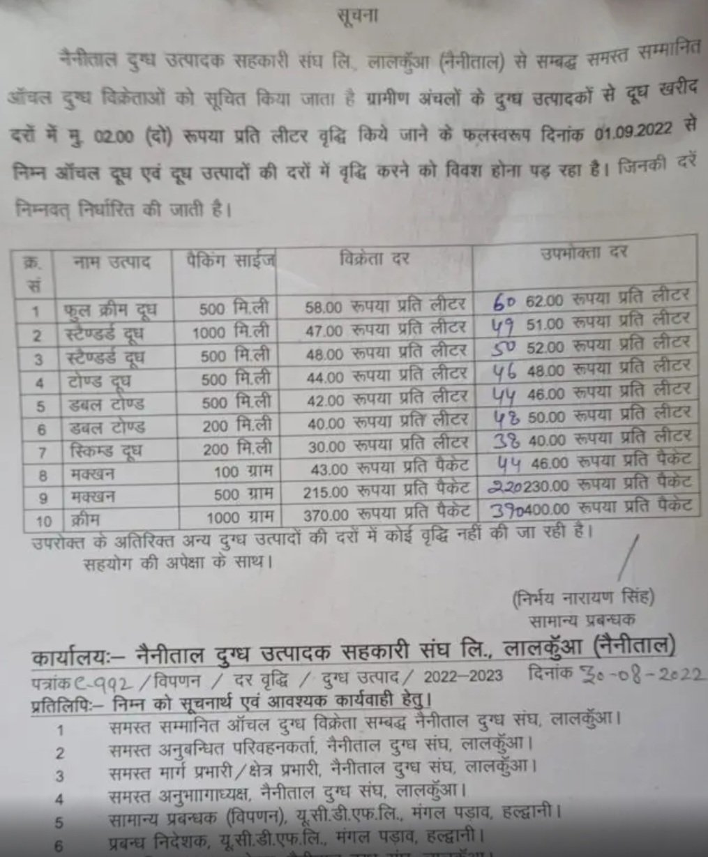 भोंपूराम खबरी। नैनीताल दुग्ध सहकारी संघ लालकुआं के अध्यक्ष मुकेश बोरा ने प्रेस वार्ता करते हुए बताया कि नैनीताल दुग्ध संघ द्वारा ग्रामीण अंचलों के दुग्ध उत्पादकों से दूध खरीद की दरों में ₹2 प्रति लीटर वृद्धि की गई है जो कि 1 सितंबर से लागू होंगी इसके साथ ही उपभोक्ताओं को भी झटका लगा है क्योंकि ₹2 प्रति लीटर दूध और दूध से बनने वाले पदार्थों पर बढ़ाया गया है। दुग्ध संघ द्वारा दुग्ध पदार्थों के 10 पदार्थों में रेट बढाये है।