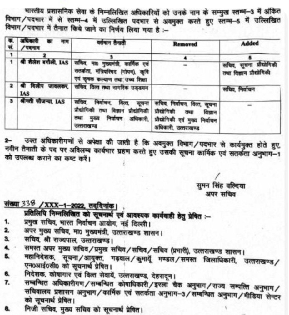 भोंपूराम खबरी। उत्तराखंड से बड़ी खबर आईएएस अधिकारियों के विभागों में हुआ फेरबदल, देहरादून दिलीप जावलकर बने मुख्य निर्वाचन अधिकारी आईएएस शैलेश बगोली को आईटी व विज्ञान प्रौद्योगिकी का अतिरिक्त चार्ज मिला,आईएएस दिलीप जावलकर के पास वित्त, समेत पुराने विभाग भी रहेंगे। मुख्य निर्वाचन अधिकारी रही सौजन्या के रिलीव होने के बाद लिया गया फैसला।