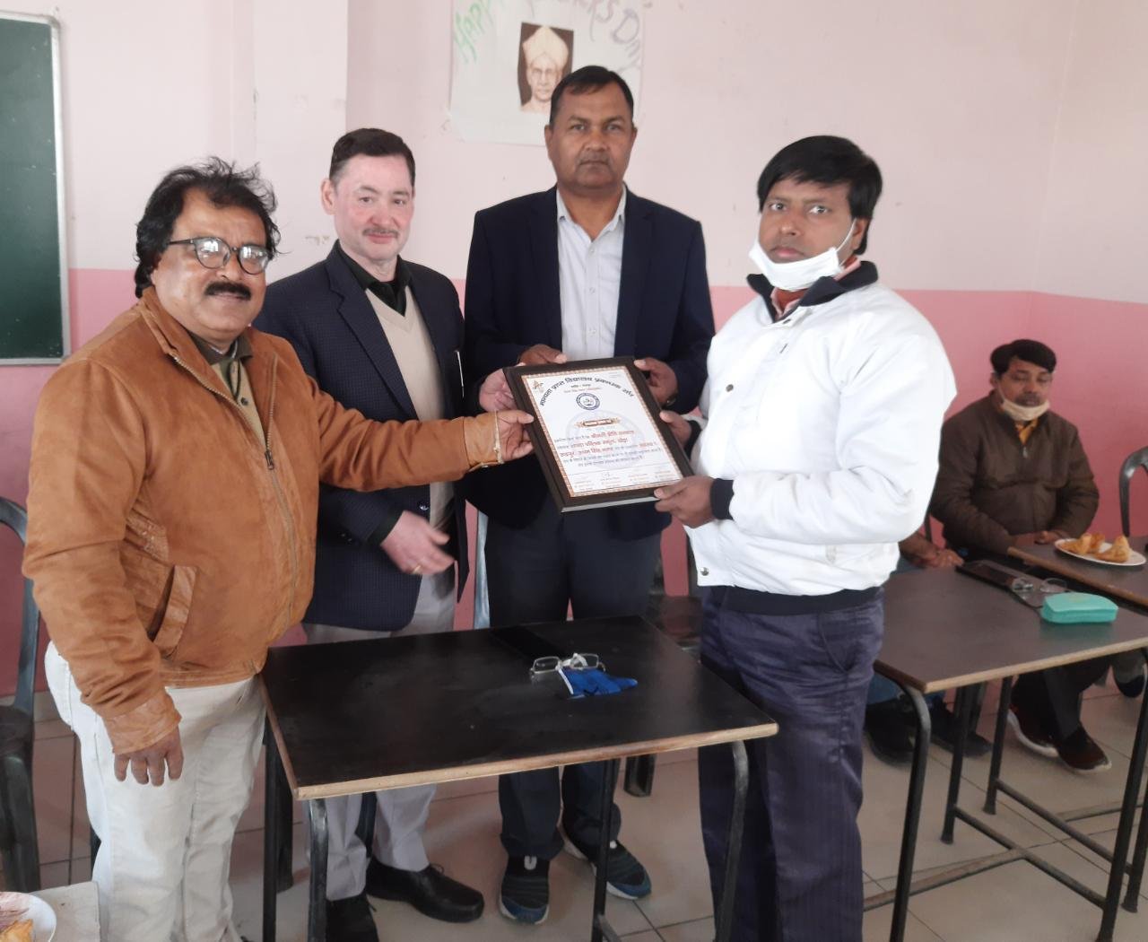 फोटो 27आरडीपी06 – मान्यता प्राप्त विद्यालय प्रबंधक संघ की बैठक में सदस्य को प्रमाण पत्र देते अतिथि।