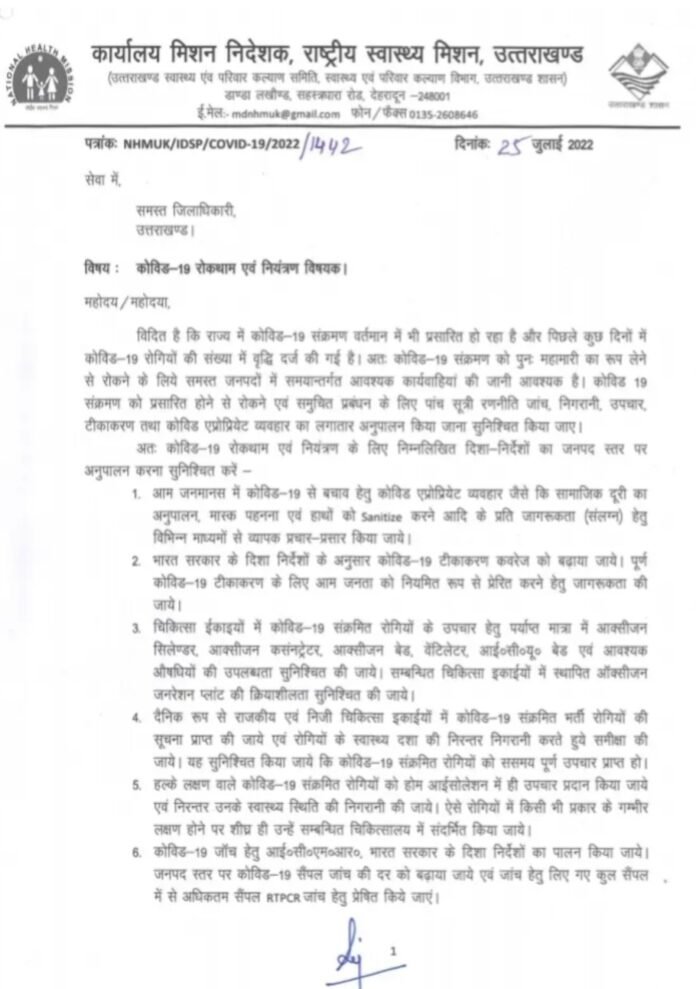 भोंपूराम खबरी,देहरादून। देहरादून से आज की सबसे बड़ी खबर आ रही है राज्य में बढ़ते कोविड-19 संक्रमण को देखते हुए कार्यालय मिशन निदेशक राष्ट्रीय स्वास्थ्य मिशन उत्तराखंड शासन ने नई दिशा निर्देश जारी करते हुए इसके सभी जिला अधिकारियों से अनुपालन सुनिश्चित करने के निर्देश दिए हैं।