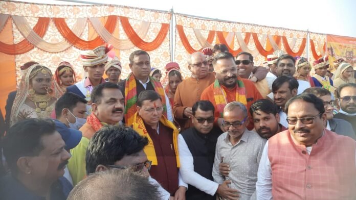भोंपूराम खबरी,रुद्रपुर। ट्रांजिट कैम्प के फुटबाल मैदान में लघु उद्योग व्यापार मंडल एवं सर्व समाज कल्याण समिति की ओर से पंचम सामूहिक विवाह कार्यक्रम में 24 जोड़े विवाह बंधन में बंधे। जिन्हे प्रदेश के मुख्यमंत्री पुष्कर सिंह धामी ने पहुंचकर आर्शीवाद देते हुए उनके सुखी दाम्पत्य जीवन की कामना की। इससे पूर्व गल्ला मंडी परिसर से बैंड बाजों के साथ सभी 24 वरों की बारात धूमधाम से निकली। जो भगत सिंह चौक, मुख्य बाजार, डीडी चौक, किच्छा बाईपास रोड होते हुए विवाह स्थल ट्रांजिट कैम्प फुटबॉल मैदान पहुंची। इस दौरान वर अपने परिजनों के साथ फूल मालाओं से सजी हुई बुग्गियों में सवार थे। विवाह स्थल पर उपस्थित विभिन्न राजनीतिक, धर्मिक, सामाजिक, व्यापारिक संगठनों के लोगों के साथ वधु पक्ष के परिजनों द्वारा अपनी-अपनी पुत्रियों के वरों का पारंपरिक रीति रिवाज के अनुसार स्वागत किया गया। जिसके बाद गायत्री परिवार शांति कंुज द्वारा सभी 24 जोड़ो की शादी विधि विधान से संपन्न कराई।