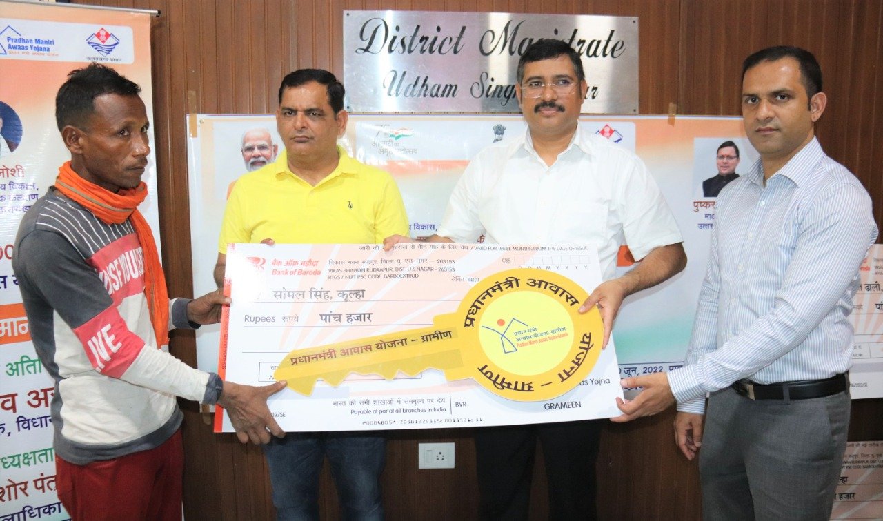 भोंपूराम खबरी,रुद्रपुर। प्रदेश के मुख्यमंत्री पुष्कर सिंह धामी ने गुरुवार को मुख्य सेवक सदन, मुख्यमंत्री आवास, देहरादून में सरकार के 100 दिन पूर्ण होने के अवसर पर सूचना एवं लोक संपर्क विभाग द्वारा आयोजित कार्यक्रम में प्रतिभाग करते हुए 100 दिन विकास के, समर्पण और प्रयास के, विकास पुस्तक का विमोचन किया। देहरादून में आयोजित लाभार्थी सम्मान समारोह से जनपद के प्रधानमंत्री आवास योजना ग्रामीण के लाभार्थी भी वीडियो काॅन्फ्रेंसिंग के जरिये जुड़े। इस अवसर पर वीसी सभागार में जनपद में प्रधानमंत्री आवास योजना ग्रामीण के अन्तर्गत निर्मित भवन स्वामियों में से 50 व्यक्तियों को भवन की चाबी तथा सीएम घोषणा के अन्तर्गत बरतन खरीदने हेतु प्रत्येक लाभार्थी को पांच-पांच हजार रूपये के चेक जिलाधिकारी युगल किशोर पन्त द्वारा वितरित किये। जिलाधिकारी युगल किशोर पन्त ने कहा कि लाभार्थियों का सम्मान के साथ ही योजनाओ के बारे में जानकारी तथा योजनाओं के प्रति जागरूक करना है। जिलाधिकारी ने योजना के माध्यम से पक्के घर का सपना पूरा करने वाले ग्रामीणों से विभिन्न पहलुओं पर विस्तार से चर्चा की। इस अवसर पर लाभार्थियों ने कहा कि पहले कच्चा घर एवं झोपड़ी होने के कारण बरसात में सबसे ज्यादा मुसीबतों का सामना करना पड़ता था, परन्तु पक्का घर बन जाने के कारण अब बरसात में भी मुसीबतों का सामना नहीं करना पड़ेगा। कभी-कभी तेज हवाओं के कारण छप्पर उड़ने के डर से छप्पर को पकड़ कर खड़ा रहना पड़ता था। मनरेगा के अन्तर्गत 95 दिन की मजदूरी तथा स्वजल के माध्यम (12000 रूपये) से शौचालय निर्माण होने से भी बहुत राहत मिली है। लाभार्थियों ने कहा कि आवास बन जाने के कारण मानसिक दबाव से भी मुक्ति मिली है। उन्होंने बुजुर्ग लाभार्थियों से लगभग 30 साल पहले क्षेत्र के हालातों के बारे में भी विस्तार से जानकारी लेते हुए कहा कि विकास एक सतत् प्रक्रिया है जोकि लगातार चलती रहेगी। उन्होंने कहा कि विकास की मुख्य धारा से पिछड़े व्यक्तियों तक योजनाओं को पहुॅचाना मुख्य उद्देश्य है।उन्होंने सभी लाभार्थियों को प्रेेरित करते हुए कहा कि ग्राम सभा की खुली बैठकों में अधिक से अधिक प्रतिभाग करें ताकि योजनाओं के चयन व विभिन्न योजनाओं का लाभ पात्र व्यक्तियों तक आसानी से पहुॅच सके।