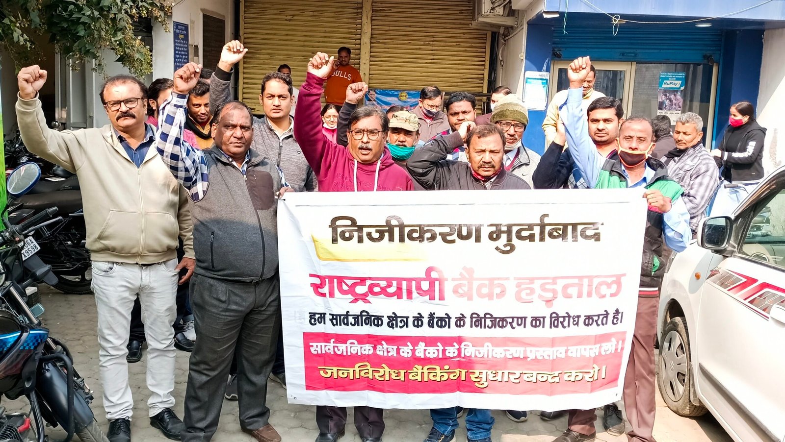 यूनाइटेड फोरम ऑफ बैंक यूनियन के आहवान पर सभी राष्ट्रीयकृत बैंकों के कर्मचारी सुबह के समय काशीपुर बाईपास रोड स्थित पीएनबी बैंक में एकत्रित हुए और जुलूस के रूप में हड़ताल के दौरान खुले हुए बैंकों में पहुंचे और उनसे नाराजगी जताते हुए नारेबाजी व प्रदर्शन किया। इस मौके पर बैंक कर्मियों ने आरोप लगाया कि बैंकों का निजीकरण कर कॉर्पाेरेट पूंजीपतियों को लाभ दिलाने का प्रयास किया जा रहा है। इस अवसर पर समीर राय, आरके छावड़ा, मनोहर सिंह, बलवंत सिंह, मनीष टोलिया, राहुल यादव, कैलाश राणा, शकील अहमद, मयंक, राजकुमार, विकास कुमार, सुनील कुमार समेत एसबीआई, सेंटर बैंक, इंडियन ओवरसीज बैंक, बैंक ऑपफ महाराष्ट्रा, पीएनबी, बीओबी, यूनियन बैंकों समेत कई बैंकों के कर्मचारी मौजूद रहे।