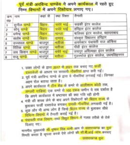 भोंपूराम खबरी। उत्तराखंड में आजकल अवैध औऱ भाई भतीजावाद के आधार पर हुई भर्तियों को लेकर बवाल मचा हुआ है। अब पूर्व शिक्षामंत्री अरविंद पांडेय द्वारा विभिन्न विभागों में लगाये गए रिश्तेदारो की सूची वायरल हो रही है। हम इस पूरी सूची की सत्यता की पुष्टि नही करते पर इनमें से कुछ नामो की जब पहाड़ टीवी द्वारा पड़ताल की गई तो वो बिल्कुल सही पाए गए।