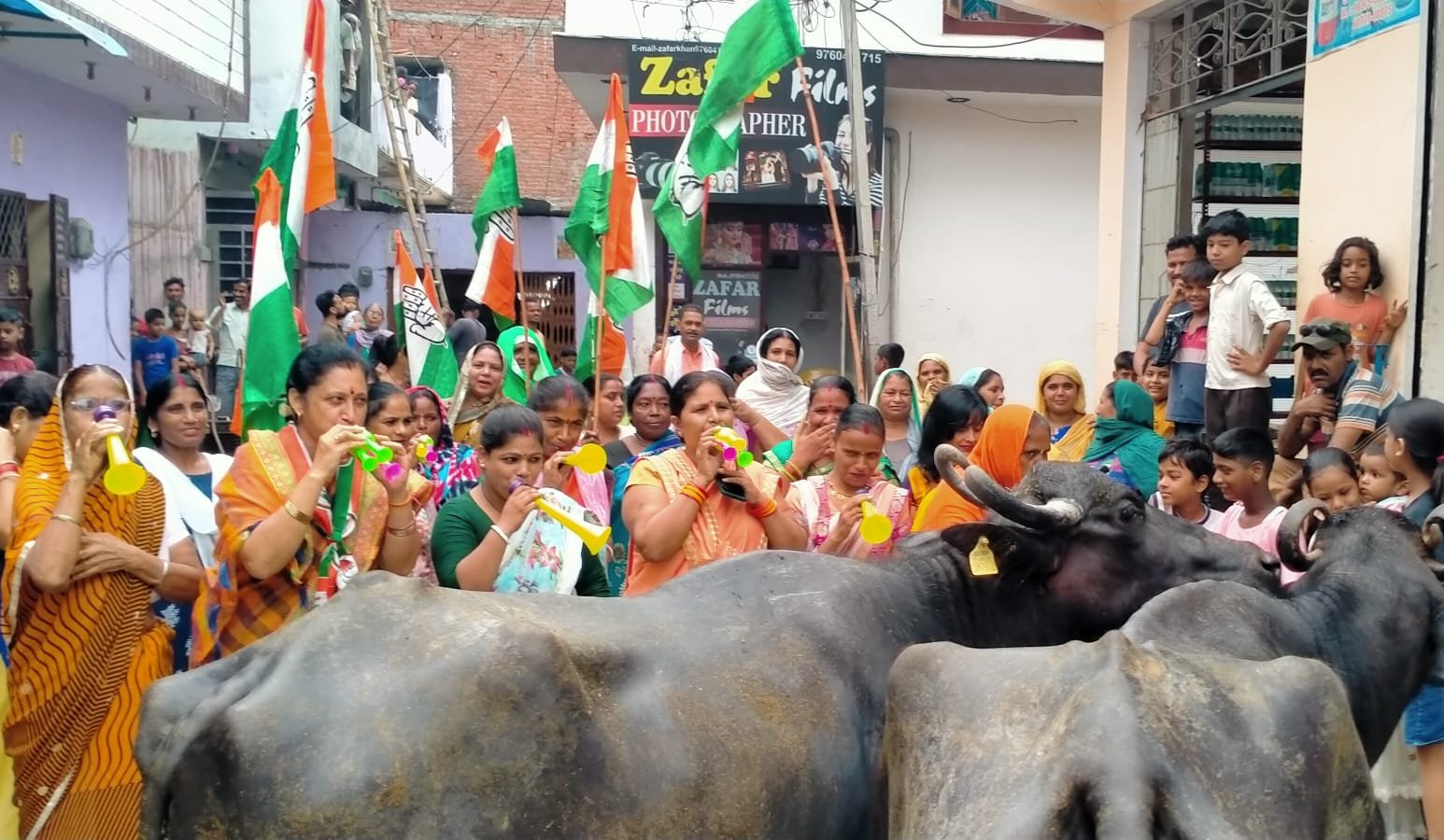 भोंपूराम खबरी, रुद्रपुर। देशभर में बढ़ती महंगाई और बेरोजगारी को लेकर उत्तराखंड प्रदेश महिला कांग्रेस कमेटी की वरिष्ठ उपाध्यक्ष और नगर पालिका परिषद की पूर्व चेयरपर्सन मीना शर्मा के नेतृत्व में दर्जनों महिलाओं ने सड़कों पर उतर कर विरोध प्रदर्शन किया। इस अवसर पर मलिन बस्ती सुभाष कालोनी में आयोजित कार्यक्रम में महिला कार्यकर्ताओं ने भैंस के आगे बीन बजाई और भाजपा सरकार के खिलाफ जमकर नारेबाजी की।