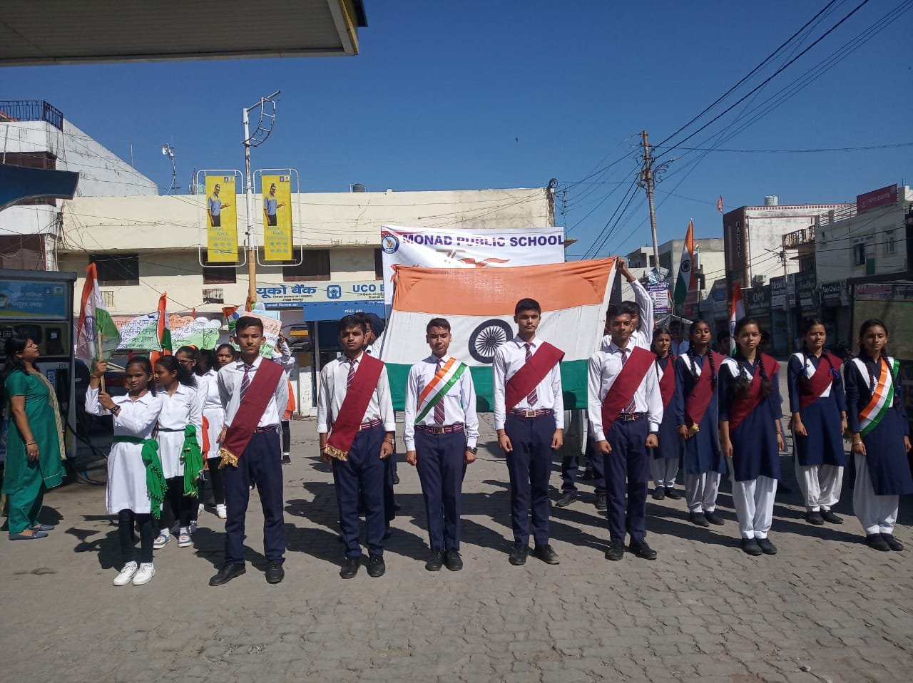 स्कूल के डायरेक्टर संजय सिंह एवं प्रधानाचार्य नेहा भारद्वाज के संयुक्त नेतृत्व में आयोजित की गई रैली में शामिल बच्चों के द्वारा हजारीलाल पेट्रोल पंप पर नुक्कड़ नाटक का आयोजन किया गया। जिसमें बच्चों ने आजादी के बाद से 75 वर्ष तक भारत देश ने तकनीकी, औद्योगिक ,कला,एवं रक्षा के क्षेत्र में जो ऐतिहासिक कार्य किया है उनकी उपलब्धियों का बखान किया गया। उन्होंने भारतवर्ष की उपलब्धियों को अपने विचारों के माध्यम से भी प्रदर्शित किया।साथ ही अध्यापिका रेखा पांडे और किरण थापा द्वारा तैयार किए गए नुक्कड़ नाटक की लोगों ने जमकर प्रशंसा की गई तत्पश्चात रैली मुख्य बाजार होते हुए सकैनिया रोड तथा अनाज मंडी से होकर वापिस मोनाड स्कूल पहुंची इस दौरान बच्चों द्वारा हाथों में तिरंगे झंडों का प्रदर्शन करने के साथ भारत माता की जय का जय घोष करते हुए देशभक्ति गीतों की प्रस्तुति भी दी गई। रैली में अध्यापक बलनीत सिंह,अनिल कुशवाहा, संजय सिकदार ,प्रदीप शाही, राकेश सिंह एवं प्रेरणा डाबर के अलावा तमाम बालक-बालिकाएं मौजूद रहे l
