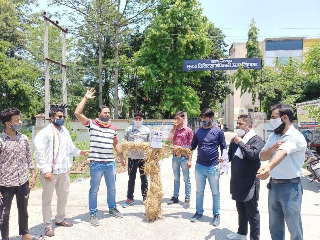 भोंपूराम खबरी रुद्रपुर। युवक कांग्रेस महानगर अध्यक्ष राजेन्द्र निषाद मोनू व सौरव बेहड़ के नेतृत्व में बुधवार को युवाओं ने उधम सिंह नगर के मुख्य चिकित्सा अधिकारी का पुतला दहन किया। युवाओं ने शासन से सीएमओ डॉ देवेन्द्र पंचपाल के निलंबन की मांग करी।