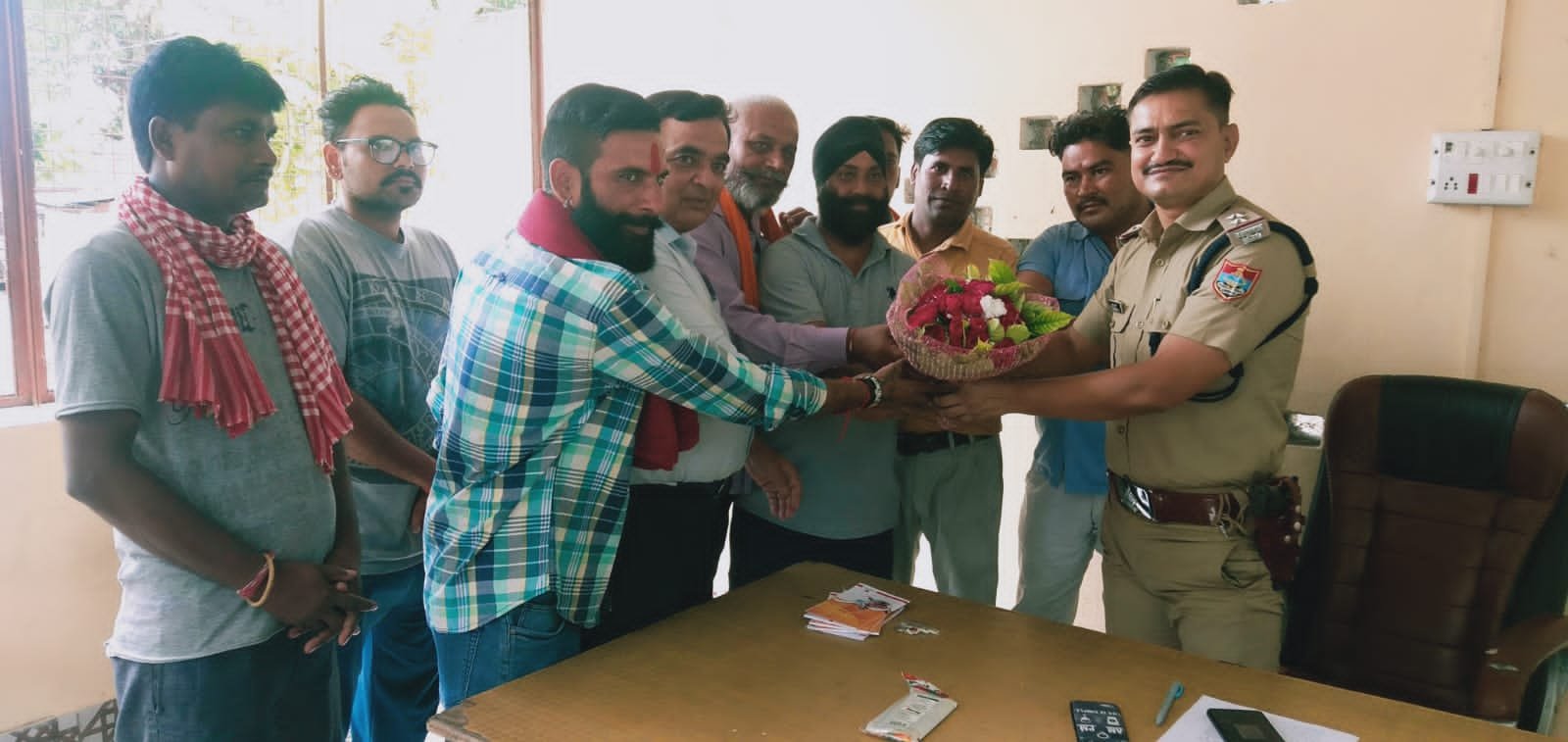 राष्ट्रीय बजरंग दल के दर्जनों कार्यकर्ता अंतरराष्ट्रीय हिंदू परिषद के प्रांतीय अध्यक्ष डॉ राजीव कुमार महाजन के नेतृत्व में थाने पर एकत्र हुए जहां उन्होंने नवनियुक्त प्रभारी निरीक्षक राजेश पांडे को कार्यभार ग्रहण करने की बधाई देते हुए उन्हें पुष्प गुच्छ भेंट कर सभासद के यहां लाखों रुपए की चोरी का खुलासा करने पर सम्मानित किया गया। सम्मानित करने वालों में डॉक्टर आरके महाजन हरजीत चन्ना अमित धींगरा सहित दर्जनों कार्यकर्ता मौजूद रहे।