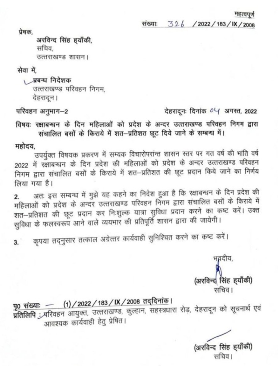 भोंपूराम खबरी। मुख्यमंत्री पुष्कर सिंह धामी ने रक्षाबंधन के दिन महिलाओं को उत्तराखंड परिवहन निगम द्वारा संचालित बसों के किराये में शत-प्रतिशत छूट दिए जाने का निर्णय लिया गया है। इस संबंध में सचिव अरविन्द सिंह ह्याँकी ने आदेश जारी किया है। सचिव अरविंद सिंह ह्याँकी द्वारा जारी किए गए आदेश में शासन स्तर पर गत वर्ष की भांति वर्ष 2022 में रक्षाबन्धन के दिन प्रदेश की महिलाओं को प्रदेश के अन्दर उत्तराखण्ड परिवहन निगम द्वारा संचालित बसों के किराये में शत-प्रतिशत की छूट प्रदान कर निःशुल्क यात्रा सुविधा प्रदान करने का निर्णय लिया गया है। उपर्युक्त सुविधा के फलस्वरूप आने वाले व्ययभार की प्रतिपूर्ति शासन द्वारा की जायेगी।