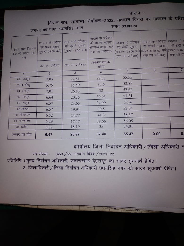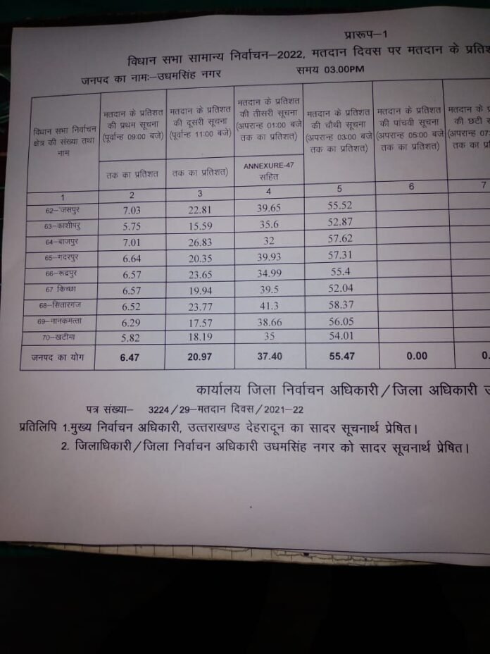 भोंपूराम खबरी,रुद्रपुर। उत्तराखंड में हो रहे विधानसभा चुनाव के लिए उधम सिंह नगर में दोपहर 3 बजे तक करीब 55.47 प्रतिशतमतदान हुआ। जनपद की नौ विधानसभाओं में दोपहर तीन बजे तक बढिय़ा वोट प्रतिशत रहा है। जानकारी के अनुसार दोपहर 3बजे तक जसपुर में 55.52, काशीपुर में 52.87, बाजपुर में57.62, गदरपुर में 57.37, रुद्रपुर में 55.4, किच्छा में 52.04,सितारगंज में 58.37, नानकमत्ता में 56.05और मुख्यमंत्री की सीट खटीमा में 54.01 प्रतिशत मतदान हुआ है।