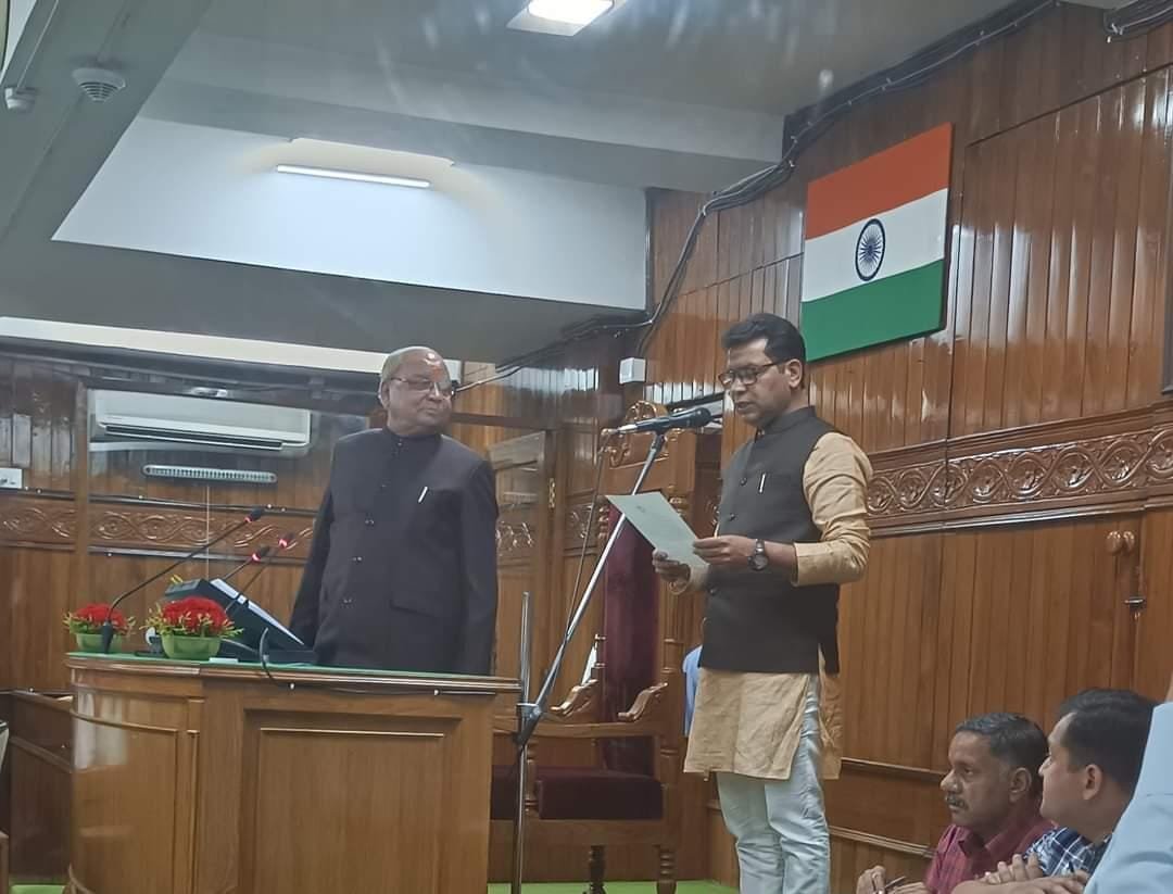 नवनिर्वाचित विधायक शिव अरोरा को विधानसभा में प्रोटेम स्पीकर बंशीधर भगत ने शपथ दिलाई
